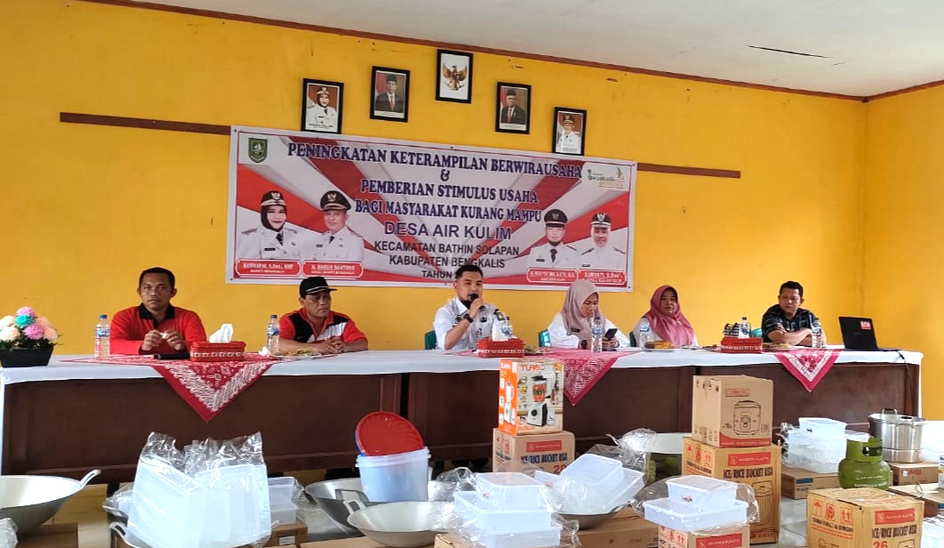 Pemberian bantuan stimulus usaha dan pelatihan ketrampilan berwirausaha dibuka oleh Camat Bathin Solapan Muhammad Rusydy S.STP, M.Si didampingi Pj Kades Air Kulim Suryati S.Sos.